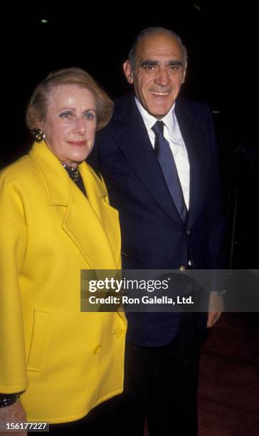 Actor Abe Vigoda and wife Beatrice Schy attend the premiere of 'Joe vs. The Volcano' on March 7, 1990 at Mann Regent Theater in Los Angeles, California. (Photo by Ron Galella, Ltd./Ron Galella Collection via Getty Images)
